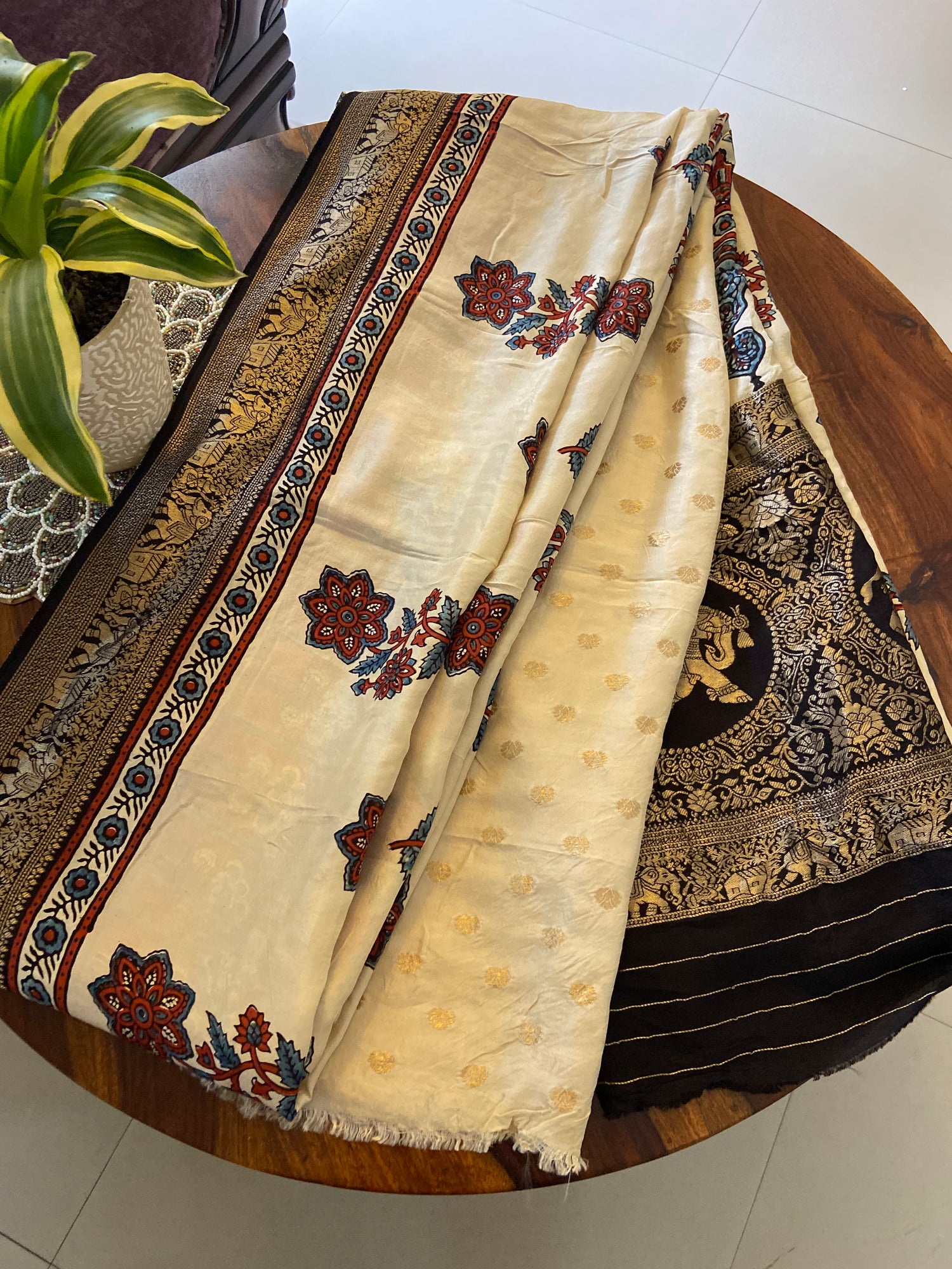 The Ajrakh Dola Silk Saree is where timeless tradition meets luxurious elegance....