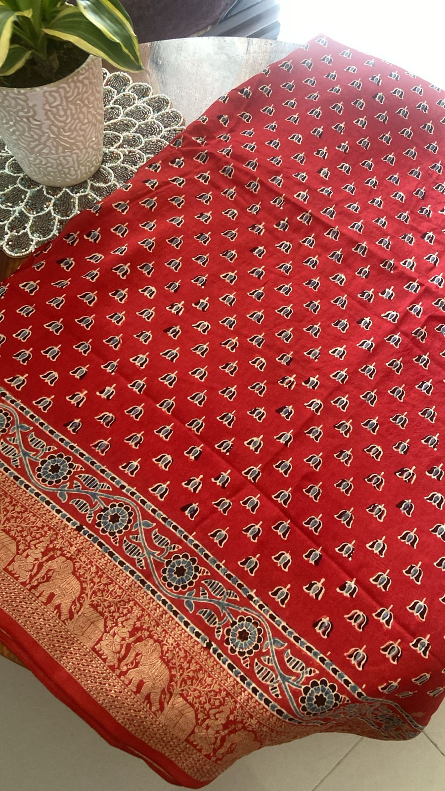 Ajrakh hand block printed Dola silk sarees are a blend of luxurious fabric and timeless craftsmanship. Made from smooth, flowy Dola silk, these sarees feature intricate Ajrakh patterns created using traditional wooden blocks and natural dyes. Each saree showcases rich geometric and floral motifs in earthy tones like indigo, rust, and maroon.