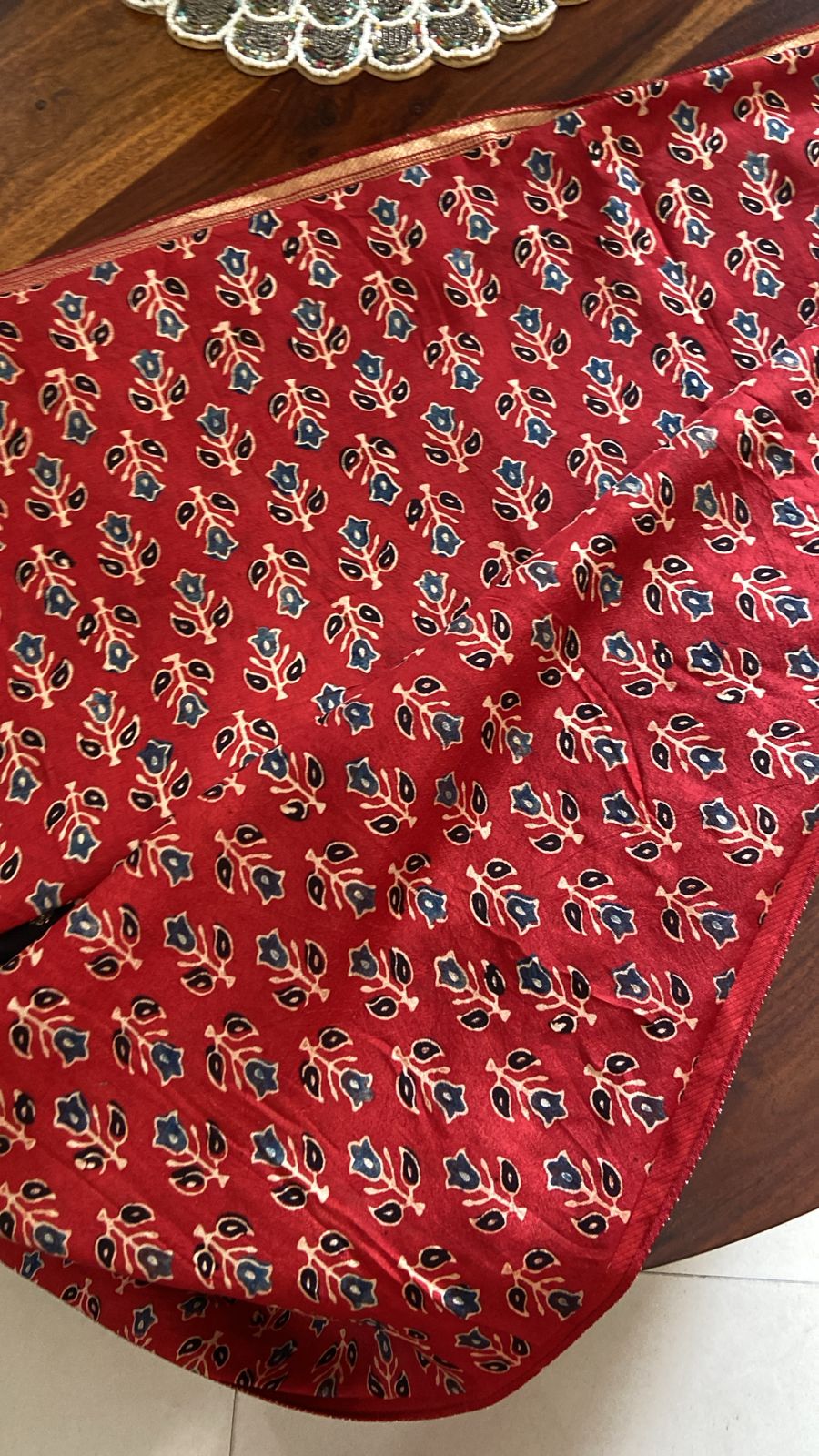 Ajrakh hand block printed Dola silk sarees are a blend of luxurious fabric and timeless craftsmanship. Made from smooth, flowy Dola silk, these sarees feature intricate Ajrakh patterns created using traditional wooden blocks and natural dyes. Each saree showcases rich geometric and floral motifs in earthy tones like indigo, rust, and maroon.