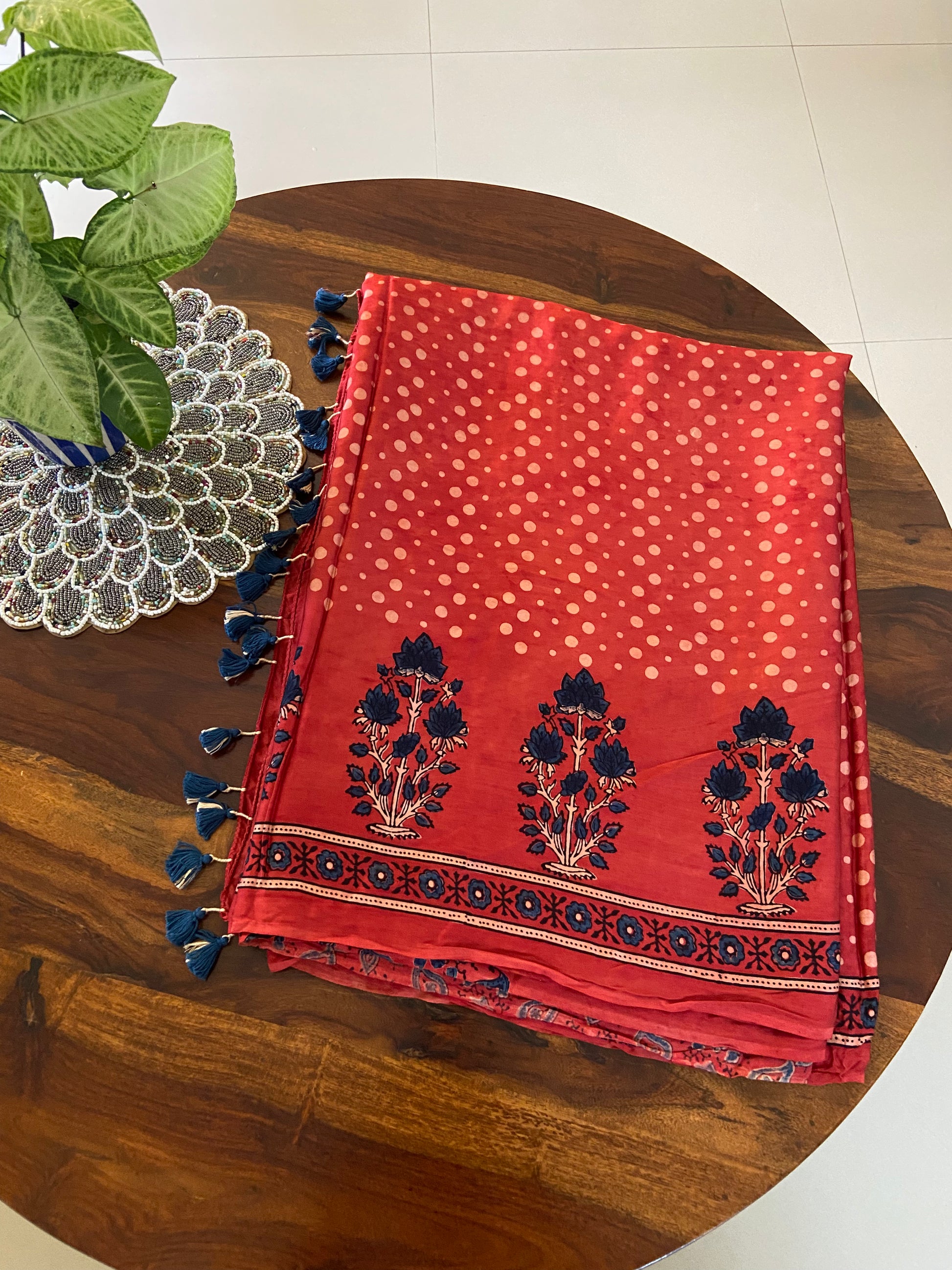 This Handblock printed pure modal silk saree with tassels is a graceful blend of tradition and modern elegance. Crafted from soft, lustrous modal silk, it drapes effortlessly, offering comfort with a luxurious sheen. The handblock prints showcase intricate patterns created by skilled artisans, reflecting heritage and timeless artistry.