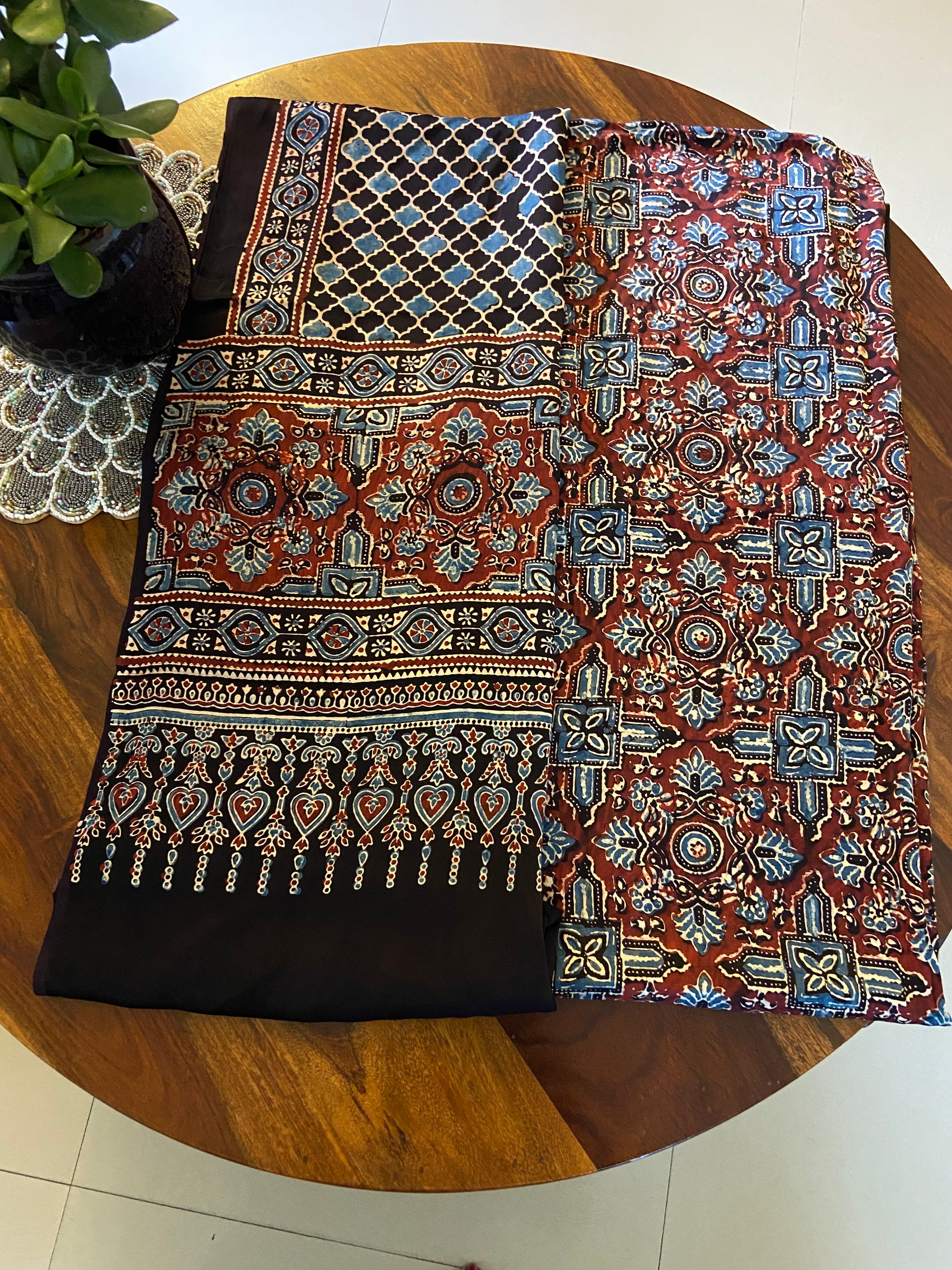 This Ajrakh modal silk natural dye top and dupatta suit set is a timeless blend of tradition and elegance. Crafted from luxuriously soft modal silk, it features intricate Ajrakh hand block prints, created using age-old techniques and natural dyes, ensuring eco-friendly artistry.