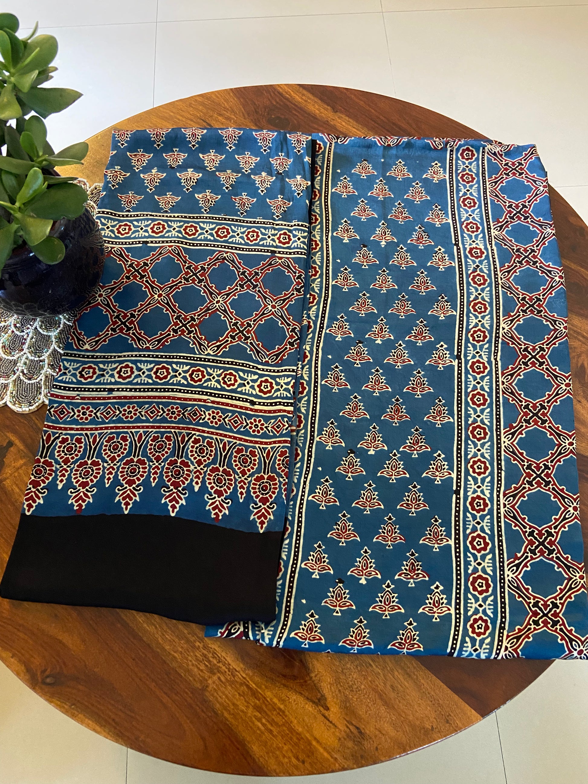 This Ajrakh modal silk natural dye top and dupatta suit set is a timeless blend of tradition and elegance. Crafted from luxuriously soft modal silk, it features intricate Ajrakh hand block prints, created using age-old techniques and natural dyes, ensuring eco-friendly artistry.