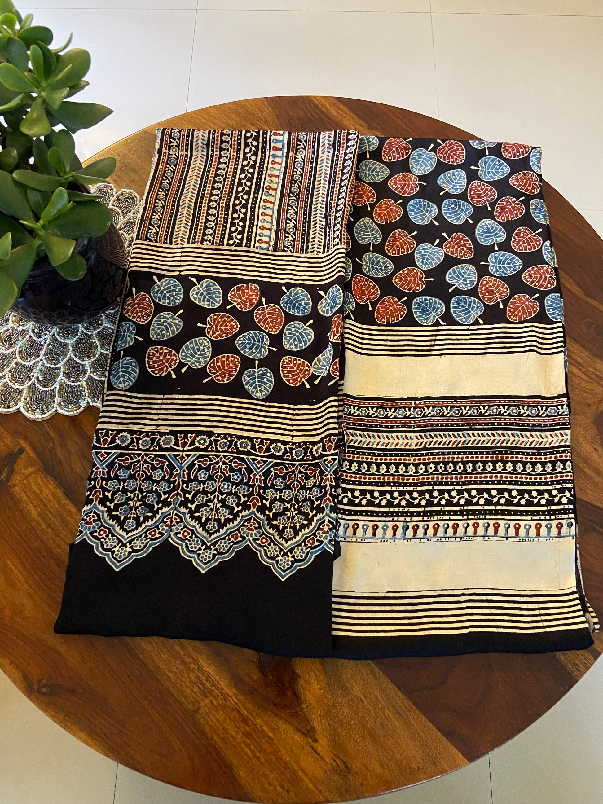 This Ajrakh modal silk natural dye top and dupatta suit set is a timeless blend of tradition and elegance. Crafted from luxuriously soft modal silk, it features intricate Ajrakh hand block prints, created using age-old techniques and natural dyes, ensuring eco-friendly artistry.