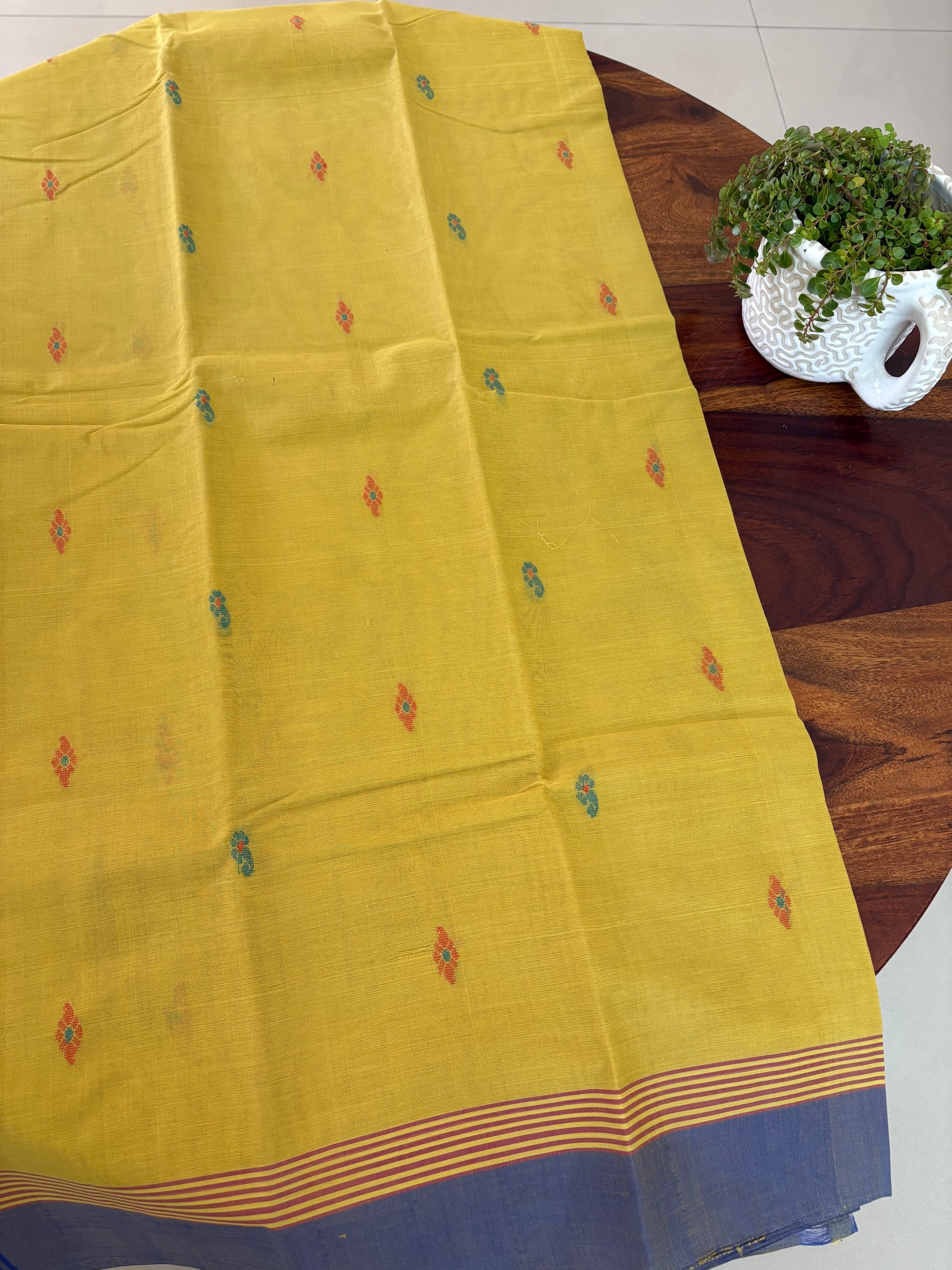 A Handloom Cotton saree with buttas is a testament to the timeless artistry of Indian weavers. Crafted on traditional wooden looms, these sarees are made from pure, breathable cotton, making them an ideal choice for the warm Indian climate. The defining feature is the "Butta" (or Butti)—small, intricate motifs like florals, paisleys, or geometric dots—that are woven directly into the fabric using extra weft threads, often in shimmering zari or contrasting colored yarn.