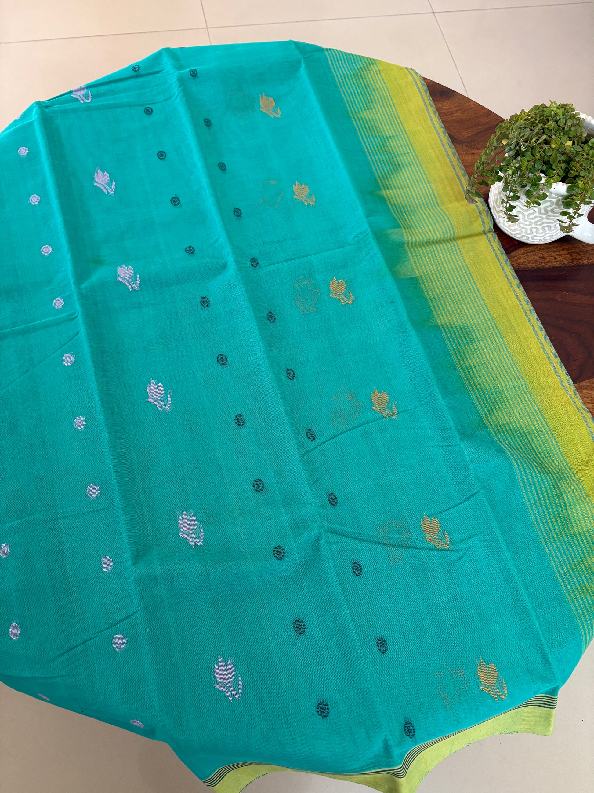 A Handloom Cotton saree with buttas is a testament to the timeless artistry of Indian weavers. Crafted on traditional wooden looms, these sarees are made from pure, breathable cotton, making them an ideal choice for the warm Indian climate. The defining feature is the "Butta" (or Butti)—small, intricate motifs like florals, paisleys, or geometric dots—that are woven directly into the fabric using extra weft threads, often in shimmering zari or contrasting colored yarn.