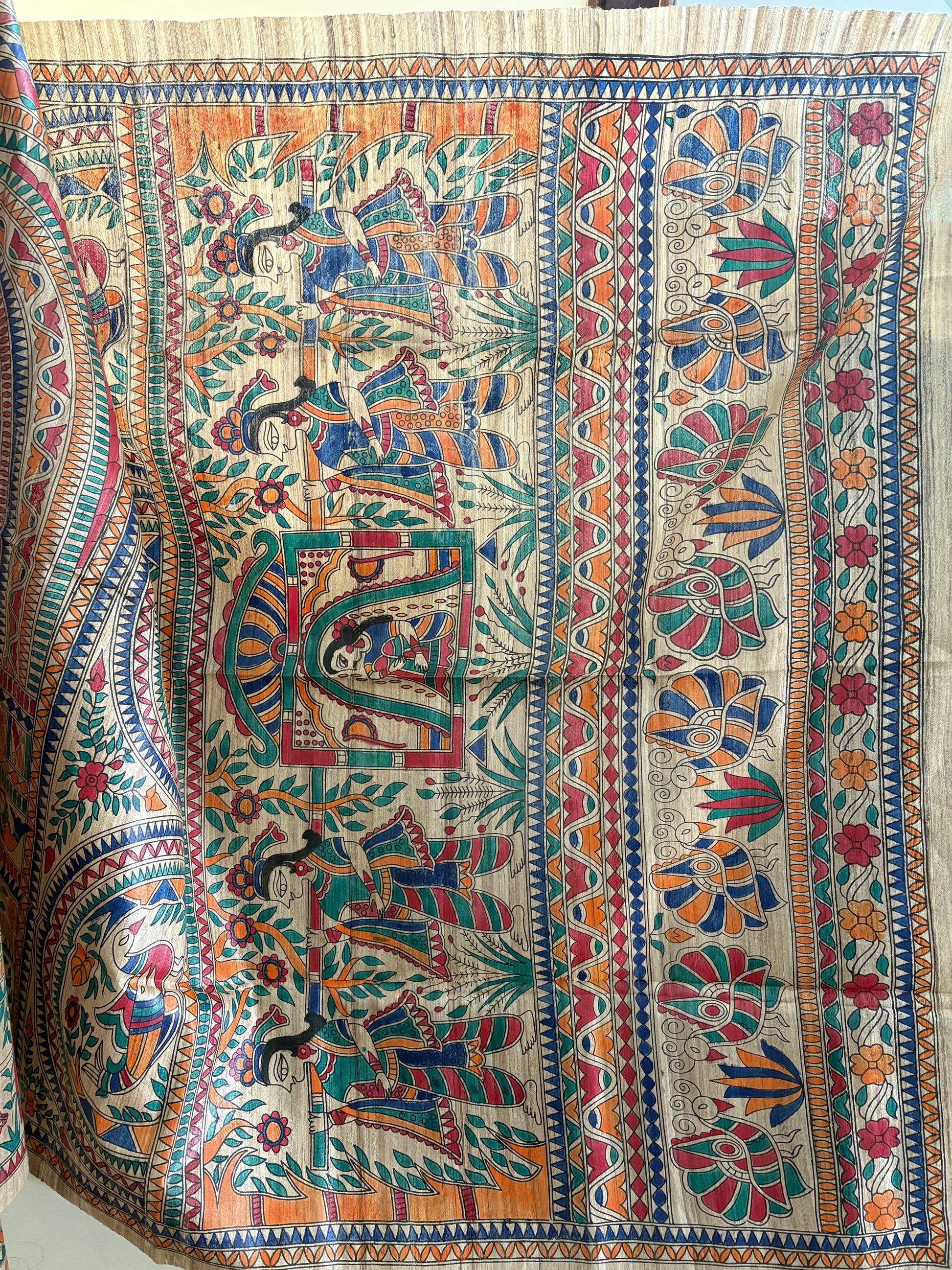 Artisans from the Mithila region transform this fabric using twigs, nibs, and matchsticks to paint intricate motifs from Hindu mythology, nature, and rural life. Because Gicha silk is more porous than refined silk, it absorbs the natural vegetable dyes deeply, giving the artwork a rich, matte finish.
