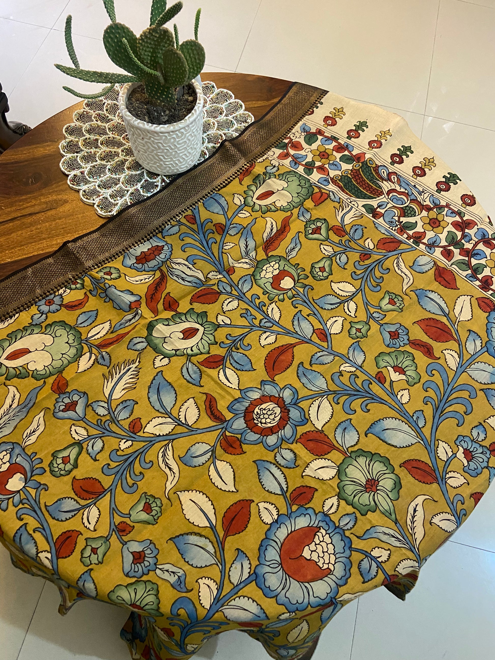 This Pen Kalamkari dupatta on Bangalore silk showcases the brilliance of traditional artistry with a modern touch. Hand-drawn with natural dyes, the intricate motifs come alive in vibrant multi-colour combinations that instantly uplift any outfit.